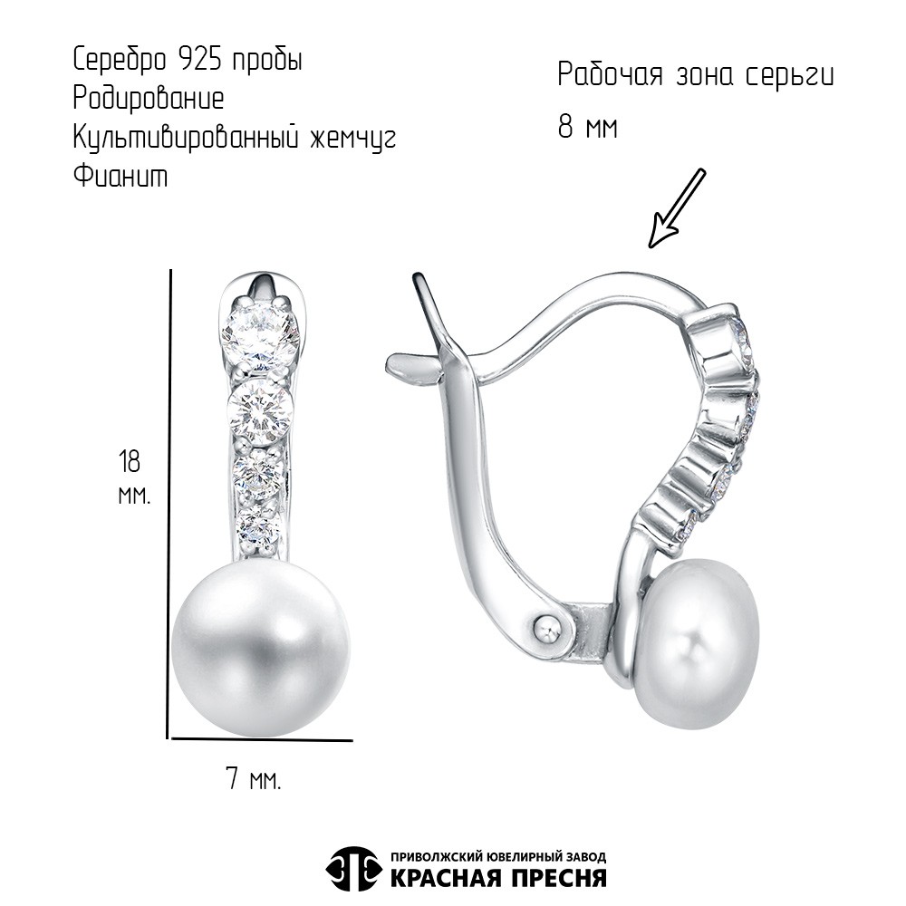 Серьги Красная пресня - Серебро 925, Жемчуг культивированный, Фианит (арт. 33317348Д)
